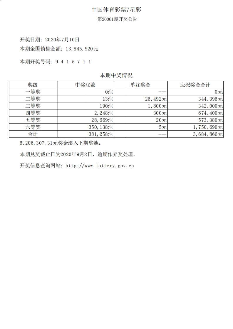 体彩7星彩20061期开奖公告