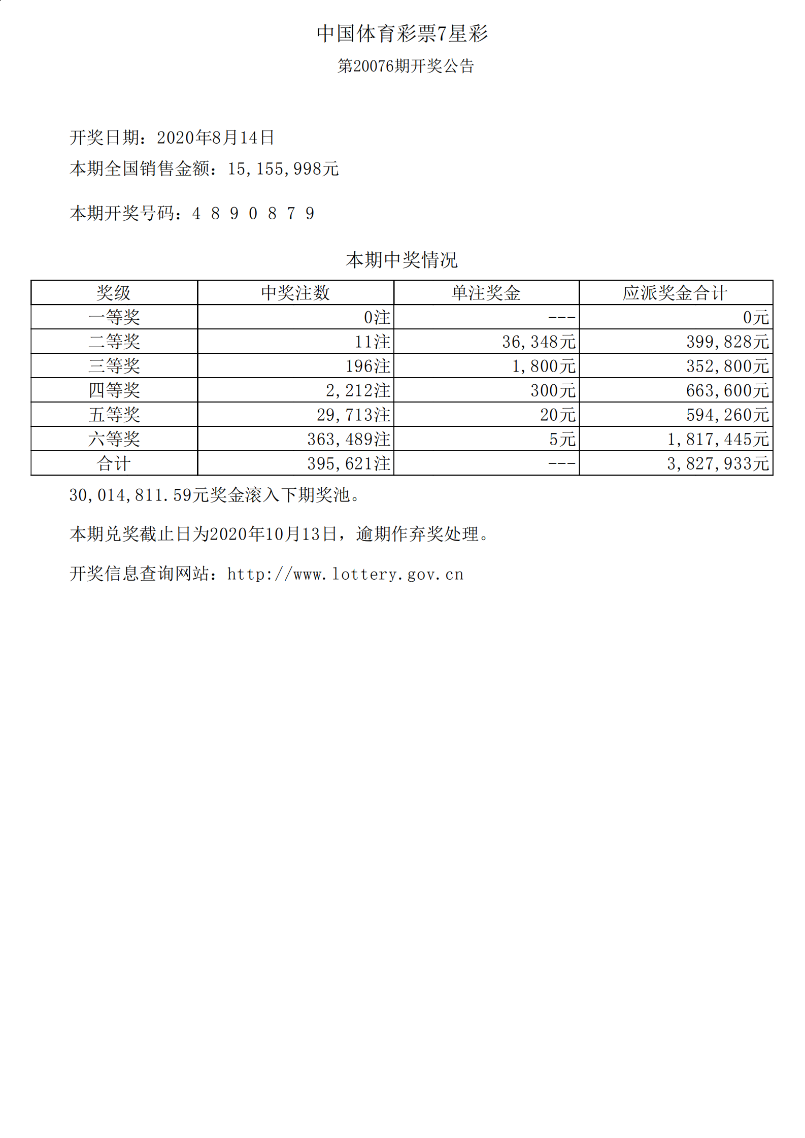 体彩7星彩20076期开奖公告