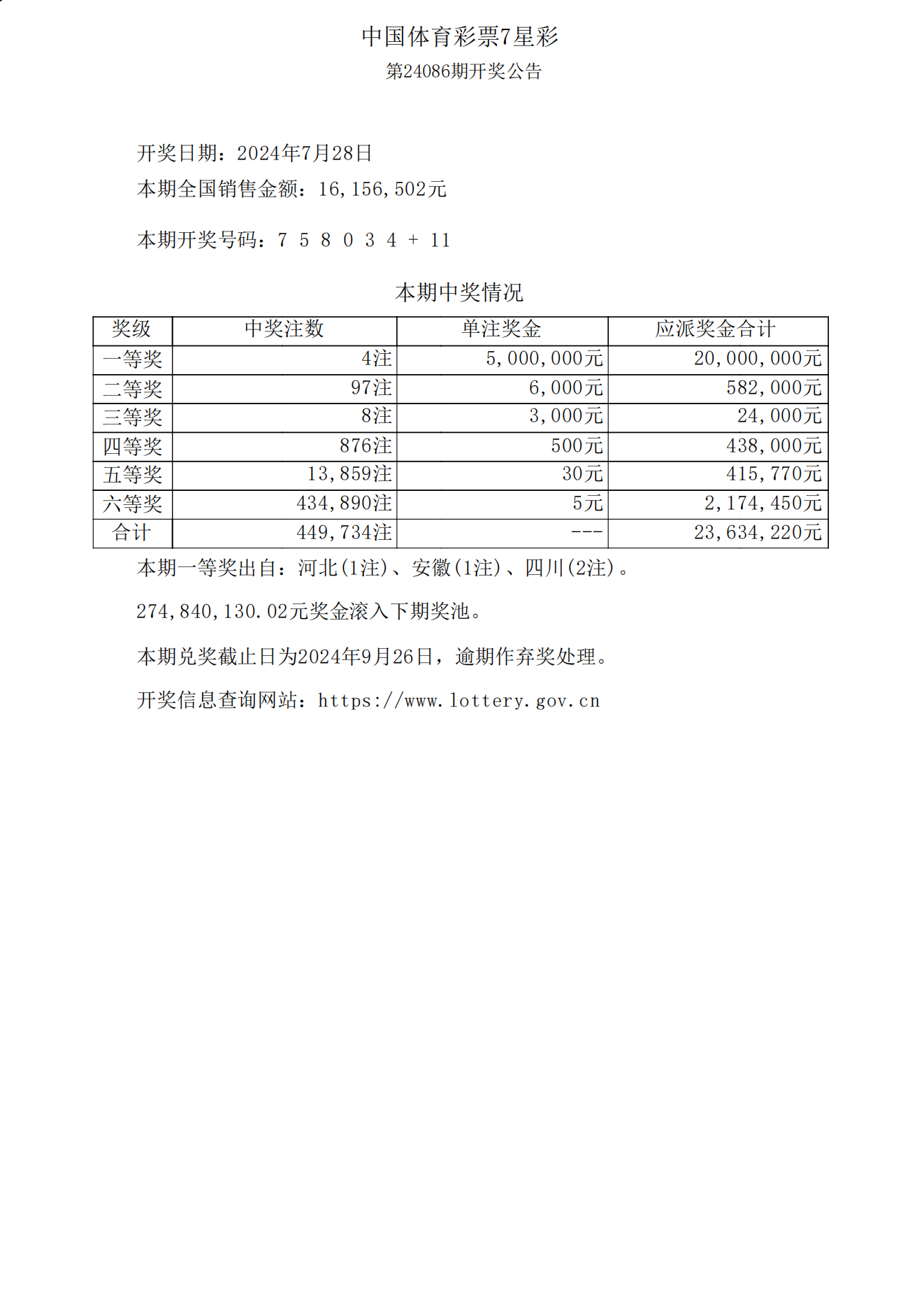 体彩7星彩24086期开奖公告