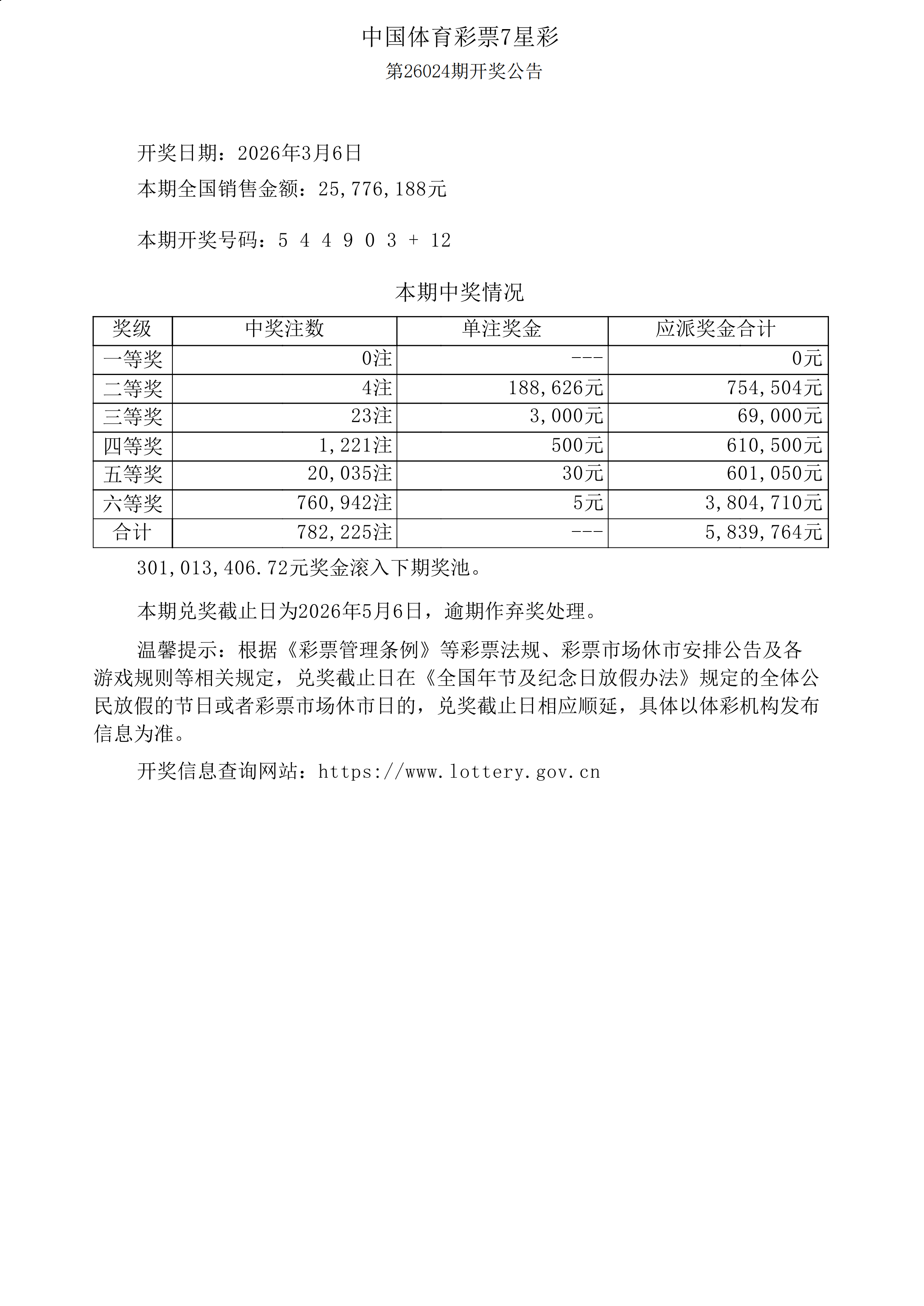 体彩7星彩26024期开奖公告