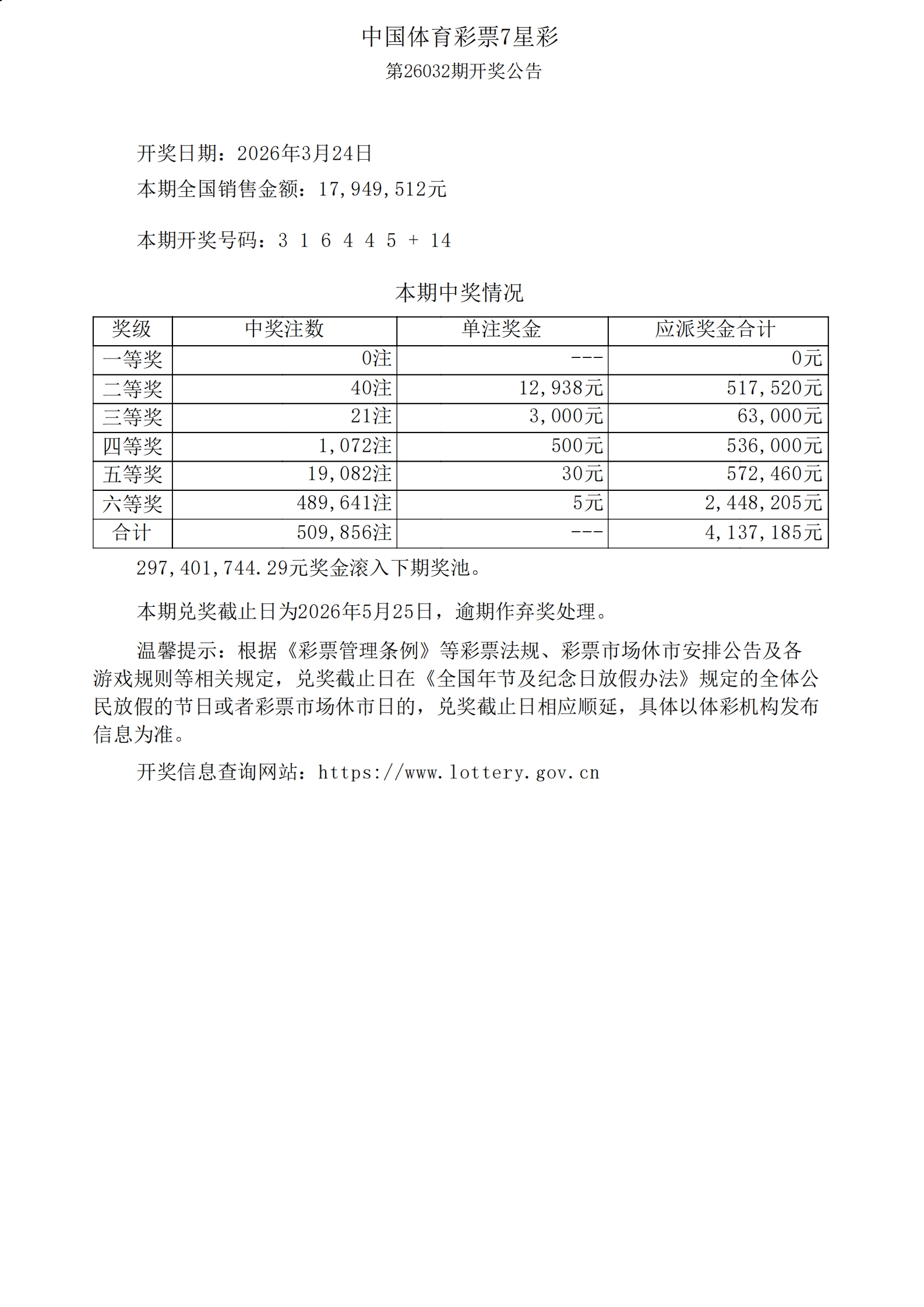 体彩7星彩26032期开奖公告