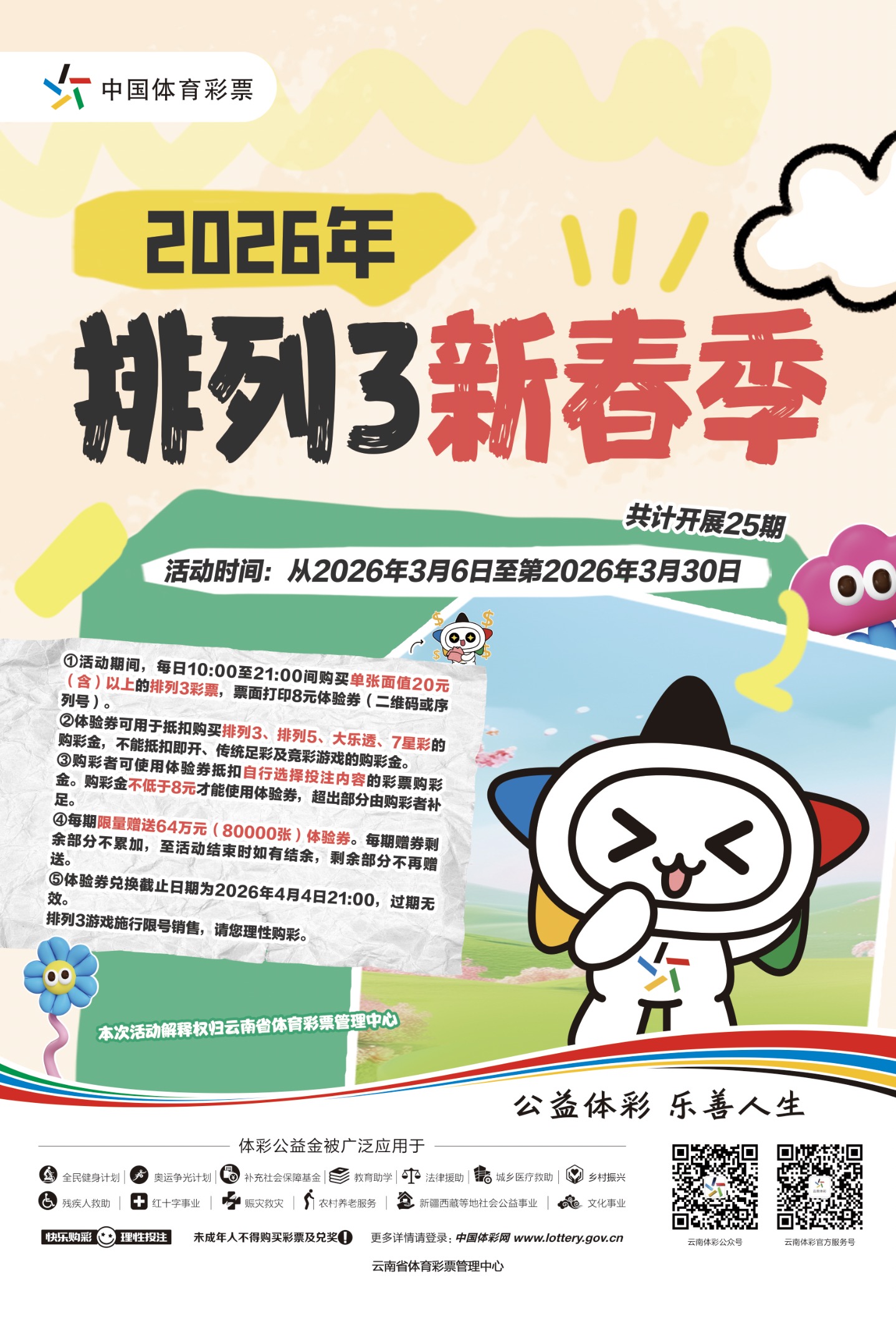 为回馈广大购彩者对中国体育彩票排列3游戏的关心和支持,经云南省体育彩票管理中心研究决定,在云南省辖区内开展2026年排列3新春季赠券活动。现就有关事项公告如下: