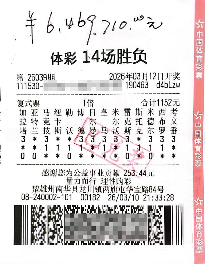 近日,第26039期“体彩14场胜负”开奖传来喜讯,购彩者段先生(化姓)喜中一等奖,揽获奖金646万元。