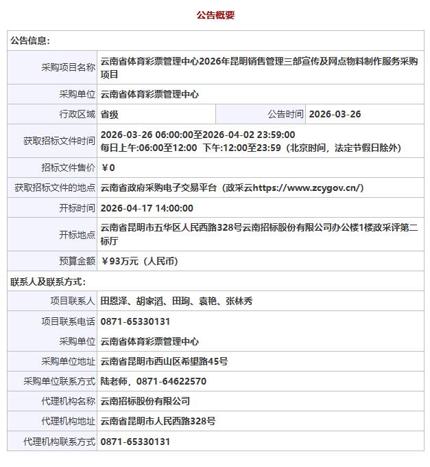 公告链接:云南省体育彩票管理中心2026年昆明销售管理三部宣传及网点物料制作服务采购项目公开招标公告