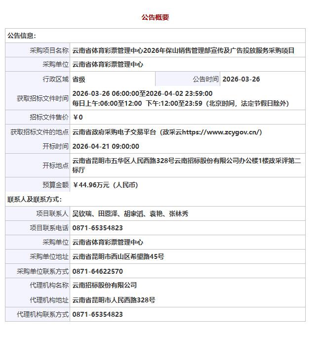公告链接:云南省体育彩票管理中心2026年保山销售管理部宣传及广告投放服务采购项目公开招标公告