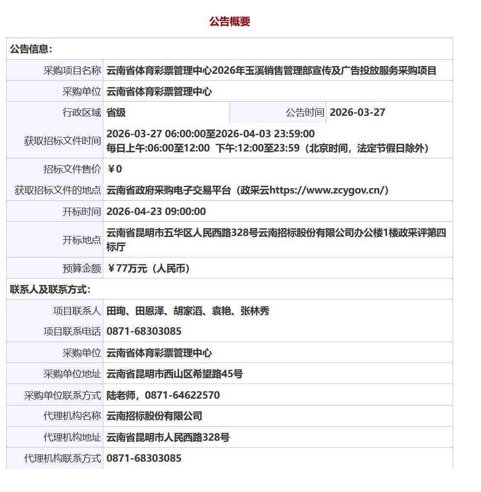 公告链接:云南省体育彩票管理中心2026年玉溪销售管理部宣传及广告投放服务采购项目公开招标公告