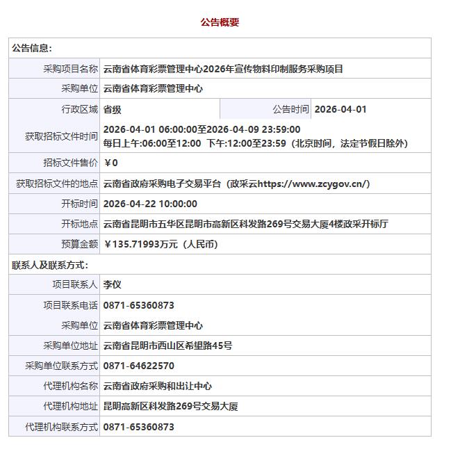 公告链接:云南省体育彩票管理中心2026年宣传物料印制服务采购项目公开招标公告