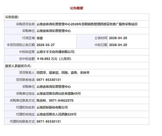公告链接:云南省体育彩票管理中心2026年昆明销售管理四部宣传推广服务采购项目中标公告
