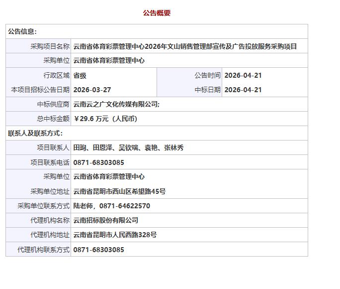 公告链接:云南省体育彩票管理中心2026年文山销售管理部宣传及广告投放服务采购项目中标公告