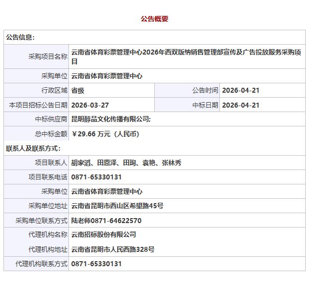 公告链接:云南省体育彩票管理中心2026年西双版纳销售管理部宣传及广告投放服务采购项目中标公告