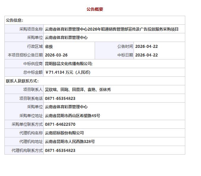 公告链接:云南省体育彩票管理中心2026年昭通销售管理部宣传及广告投放服务采购项目中标公告
