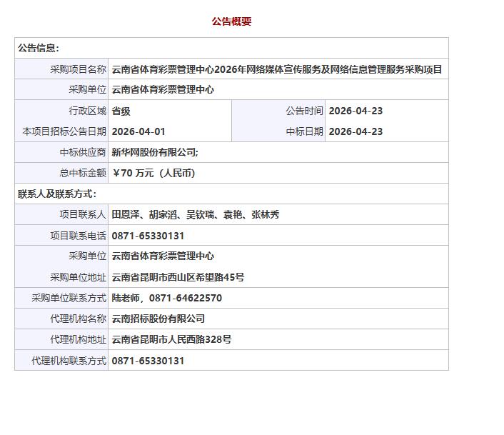 公告链接:云南省体育彩票管理中心2026年网络媒体宣传服务及网络信息管理服务采购项目中标公告