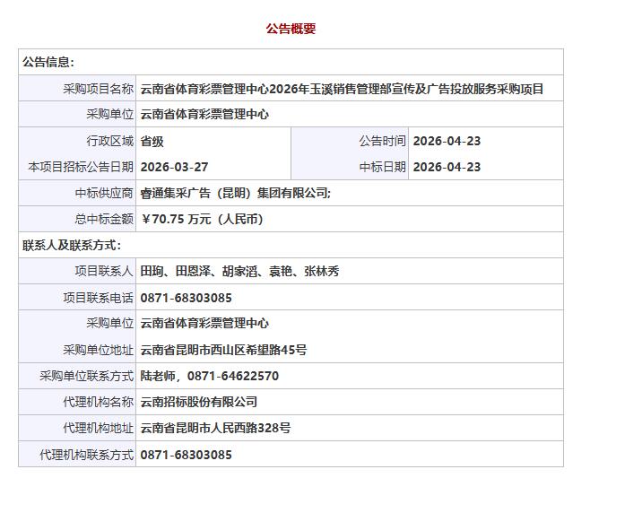 公告链接:云南省体育彩票管理中心2026年玉溪销售管理部宣传及广告投放服务采购项目中标公告