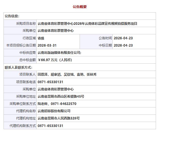 公告链接:云南省体育彩票管理中心2026年云南体彩品牌宣传视频拍摄服务项目中标公告