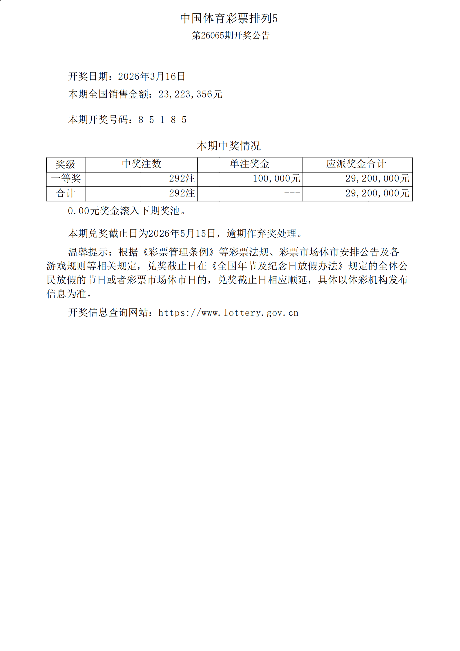 体彩排列5第26065期开奖公告