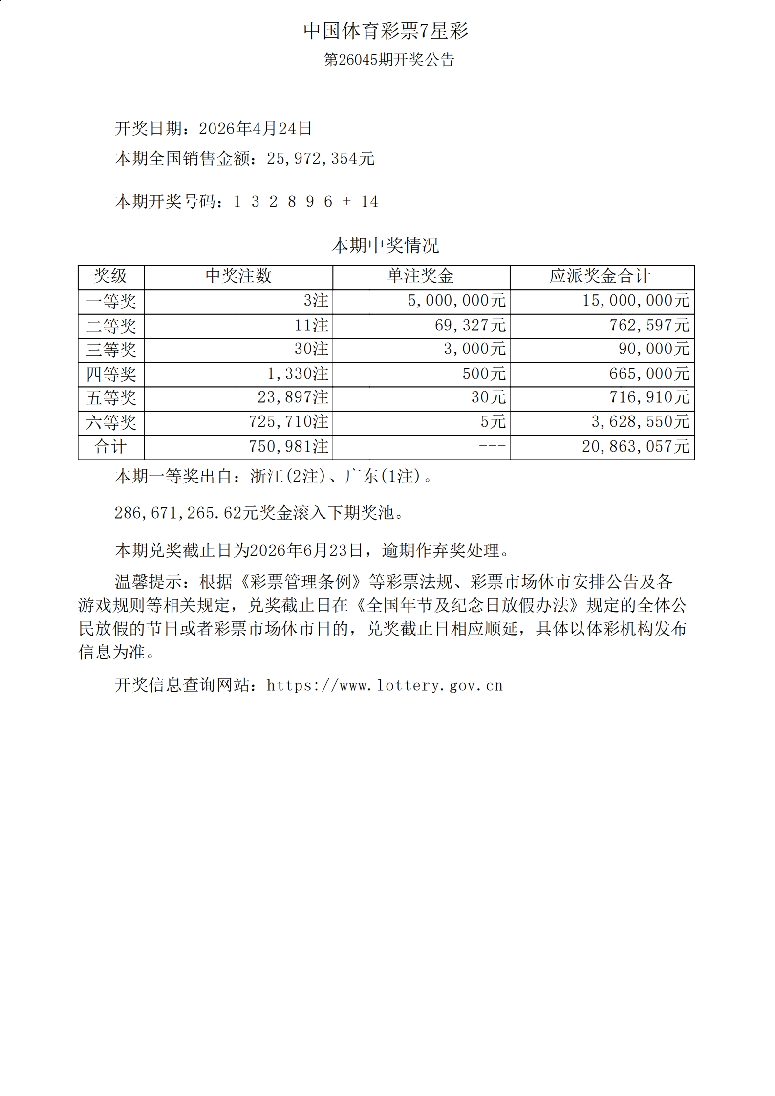 体彩7星彩26045期开奖公告